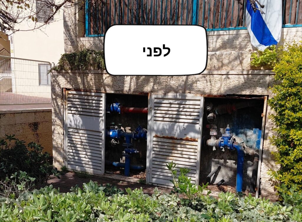 החלפת ארונות חשמל ישנים – בניין מגורים ברחוב מנחם בגין 71, פתח תקווה, ניתן לראות את הלפני צד ימין והאחרי מצד שמאל